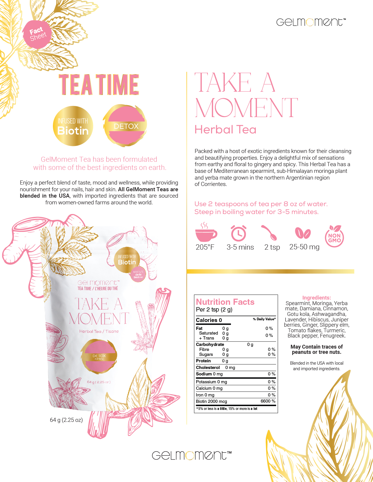 Spearmint, moringa, yerba mate, damiana, cinnamon, gotu kola, ashwagandha, lavender, hibiscus, juniper berries, ginger, slippery elm, tomato flakes, turmeric, black pepper, fenugreek.